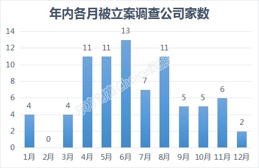 从月份上看,自从新证券法颁布加之高层表态“严打”后,被立案调查的公司数量出现一波高峰,4、5、6、8月份均超过10家。12月前5个交易日已有2家。