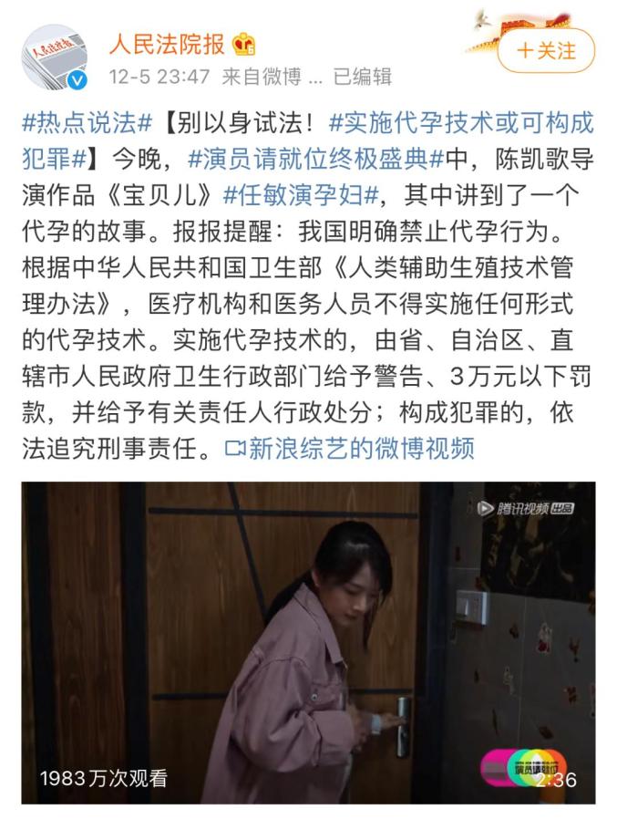 12月5日,某综艺节目中陈凯歌导演的作品《宝贝儿》被@人民法院报点名:“别以身试法!实施代孕技术或可构成犯罪”。
