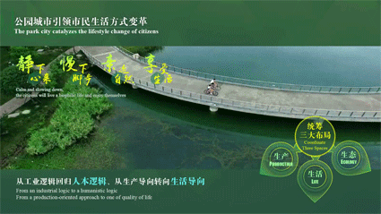 公园城市引领市民生活方式变革,统筹生产、生活、生态三大布局,引导城市发展从工业逻辑回归人本逻辑、从生产导向转向生活导向,全面推广绿色出行、简约生活,推动现代城市生活与节约社会理念相得益彰,让市民静下心来、慢下脚步,亲近自然、享受生活。