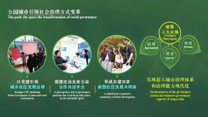 公园城市引领社会治理方式变革,统筹政府、社会、市民三大主体,以党建引领城乡社区发展治理,充分发挥基层党组织核心作用,搭建法治、友善、公益的合作共治平台,推动城市发展、社区治理、民主参与,形成共建共享新型社区发展共同体,实现超大城市治理体系和治理能力现代化。