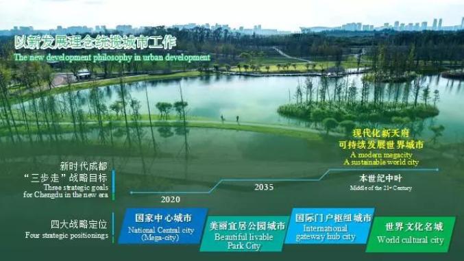 4我们坚持以新发展理念统揽城市工作,把公园城市建设作为城市战略的重要组成部分,确立了到本世纪中叶全面建成现代化新天府、成为可持续发展世界城市的新时代成都“三步走”战略目标,明确了“建设国家中心城市、美丽宜居公园城市、国际门户枢纽城市和世界文化名城”的战略定位。