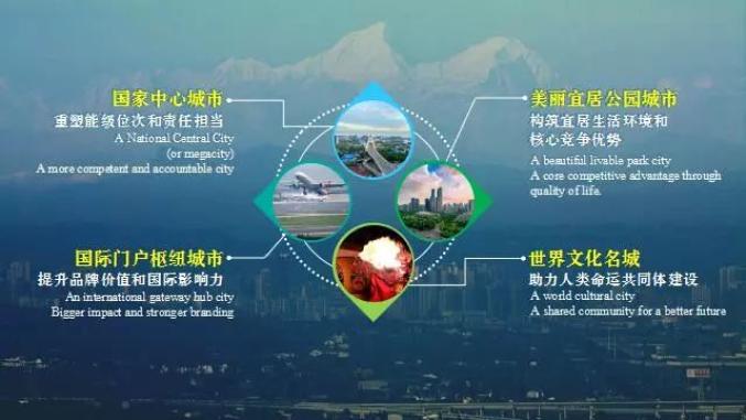 国家中心城市,顺应中华民族伟大复兴引领城市崛起的时代机遇,重塑成都在全球城市版图上的能级位次和责任担当;美丽宜居公园城市,全面贯彻落实习近平总书记的深切嘱托,构筑人城境业高度和谐统一的宜居生活环境和核心竞争优势;