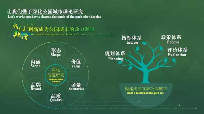 让我们携手深化公园城市理论研究。公园城市理念内涵丰富、博大精深,必将随着建设实践的深入不断创新发展。我们期待,创新成为公园城市的动力源泉,高水平、常态化举办公园城市专业研讨会和论坛,共同深化对公园城市内涵、形态、价值、场景、品质、品牌等重大问题的持续研究,共同构建美丽宜居公园城市的规划体系、指标体系、政策体系、评价体系,最大范围凝结以生态文明思想引领城市发展的广泛共识。