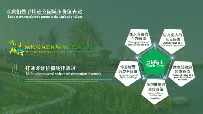 让我们携手推进公园城市价值表达。公园城市的本质在于提供有价值的生活方式。我们期待,绿色成为公园城市的普遍形态,“绿水青山就是金山银山”理念得到深入践行,多元文化场景和特色文化载体塑造别样精彩、独具特色的现代城市新意象,资源节约、环境友好、循环高效的生产方式成为新经济发展、新动能培育的重要支撑,“轨道+公交+慢行”三网融合的绿色交通体系最大限度优化交通组织方式,优质绿色公共服务供给引领形成绿色生活方式,充分彰显公园城市绿水青山的生态价值、诗意栖居的美学价值、以文化人的人文价值、绿色低碳的经济价值、简约健康的生活价值。