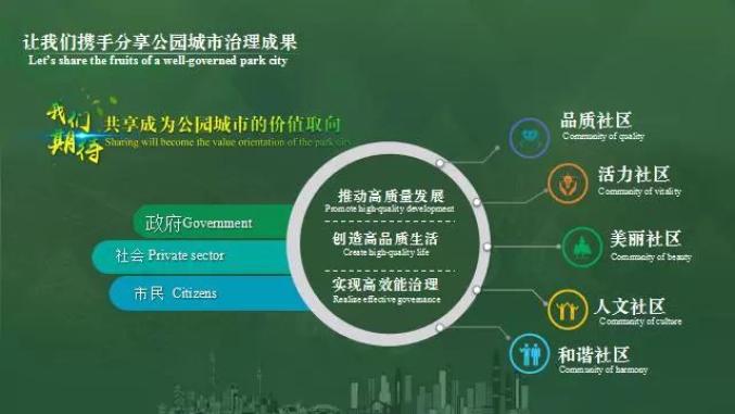 让我们携手分享公园城市治理成果。生活城市是城市追求的最高境界,良好的服务是最基本的民生,有效的治理是最普惠的福祉。