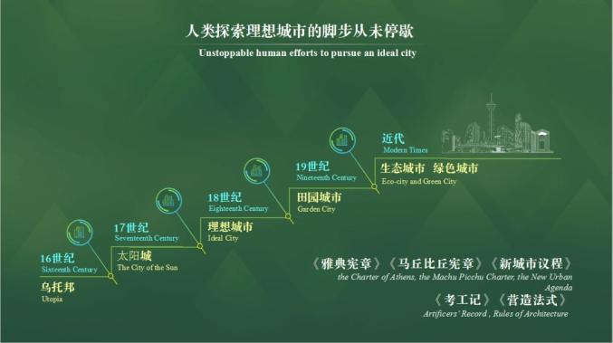 16世纪的“乌托邦”、17世纪的“太阳城”、18世纪的“理想城市”、19世纪的“田园城市”、近代的“生态城市”“绿色城市”等理论代表了各个时代人们对城市的理想追求,《雅典宪章》《马丘比丘宪章》《新城市议程》和我国春秋时期《周礼·考工记》、宋代《营造法式》、明清《工程作法》等文献体现了关于城市可持续发展、追求人本关怀的共识。