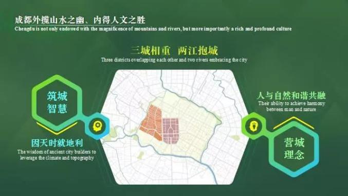 2成都外揽山水之幽、内得人文之胜。4500余年前的宝墩文化开启了成都悠久的城市文明史。战国时期张仪“因地相宜、立基高亢”修筑成都城,书写了2300余年城名未改、城址未迁的城市发展传奇。蜀郡守李冰顺应自然、师法自然修建举世闻名的都江堰水利工程,造就了农耕文明时代的“天府之国”。
