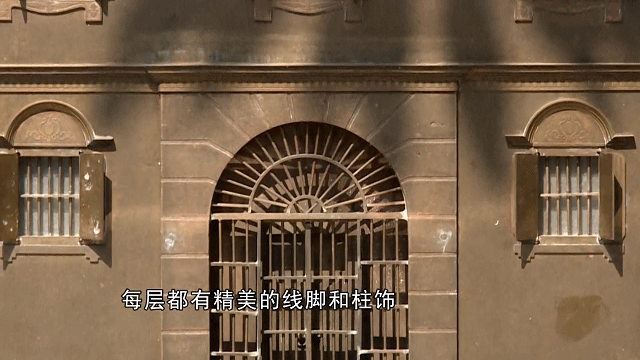 五层的顶部仿罗马拱券和四角别致的托柱