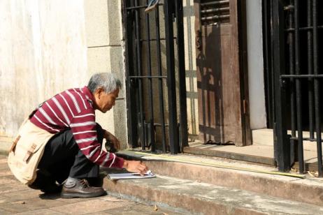 制作微缩碉楼,首先要做的就是绘图。所有工艺节点都要根据拍摄的照片手工画出图案,再经过测量的数据按比例细化加工成正规图纸。为了能够将瑞石楼原貌再现,各楼层的距离及物件他都测量了好几遍。仅仅大门上花纹间的距离及窗户,他就测出数据总数超过500个。