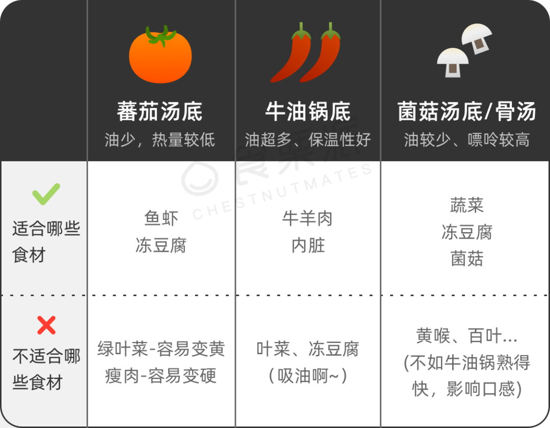 怕胖的人,避开牛油麻辣锅底,多选鱼虾等低脂肉类天然食材,既能吃到肉,又能避免摄入额外的脂肪;1份肉配上2-3份蔬菜,满可以吃得健康又满足。