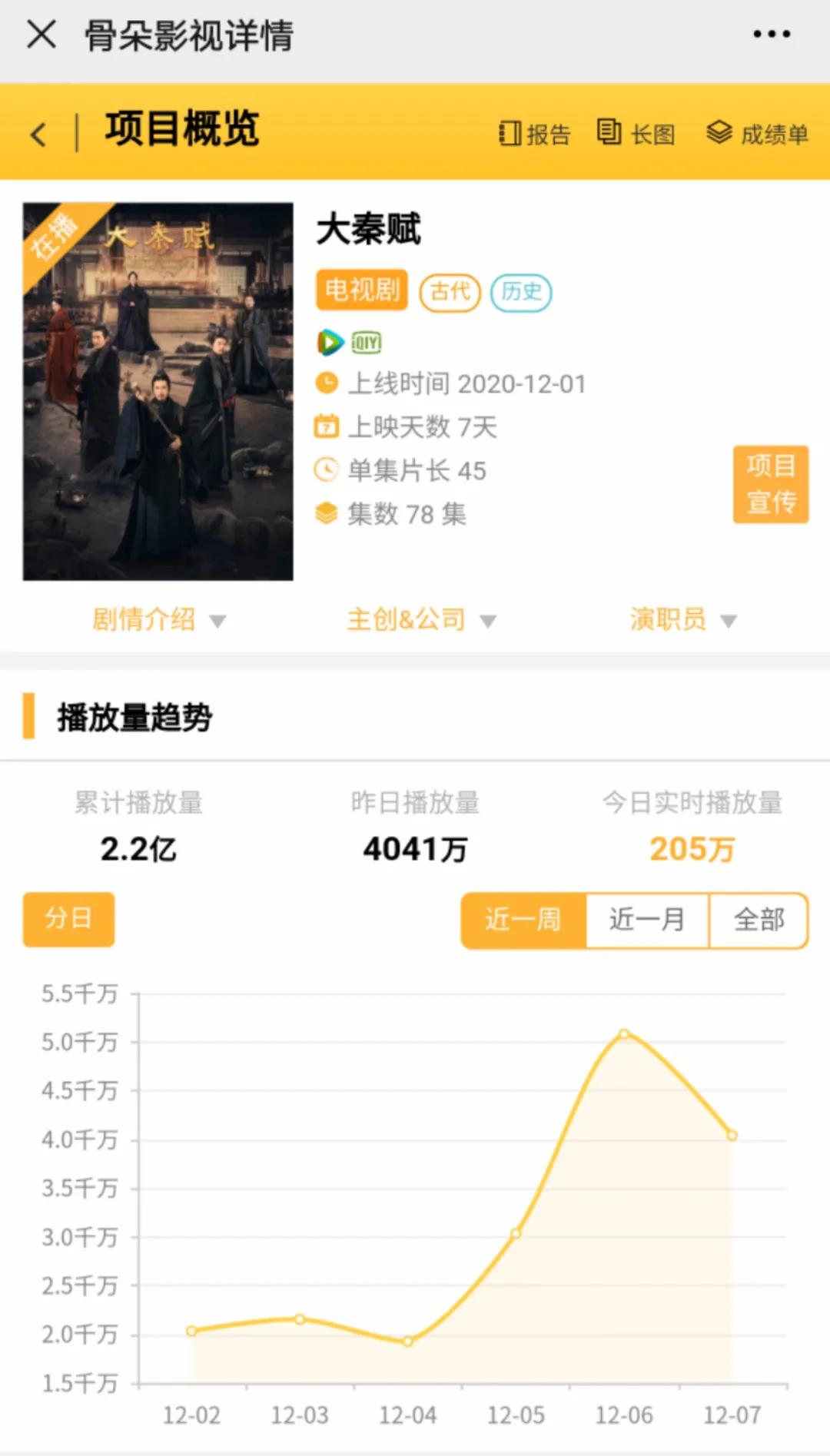 上周末,《大秦赋》在开播一周后初步收获口碑红利。根据猫眼专业版,其热度从开播时第九上升至第二(12月2日,热度9335.76),整体呈上升趋势;根据骨朵数据,该剧目前累计播放量已达2.2亿,从12月4日起持续攀升,在12月6日最高达到5079万。