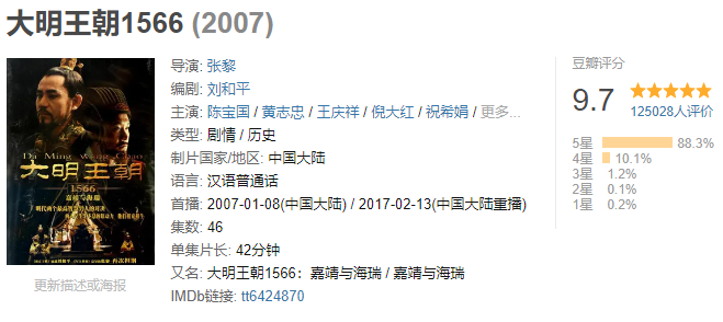 这一年,央视《贞观长歌》虽然收视率3.7%,但在该年度只排在央视第九;《大明王朝1566》在湖南卫视播出,芒果台在严肃内容领域的初体验造就了豆瓣国剧第一的9.7分神剧,但在前期投入大量资源的情况下,该剧最高收视不超过0.5%,而彼时湖南卫视电视剧的平均收视率是2%-3%。