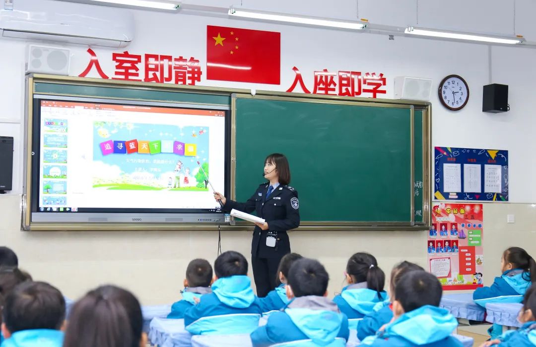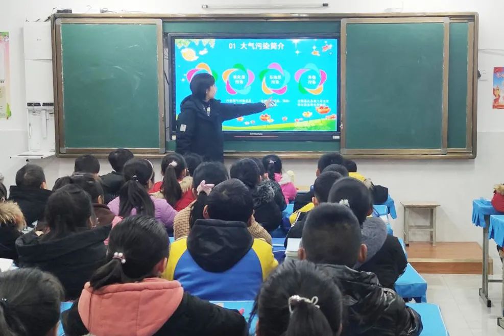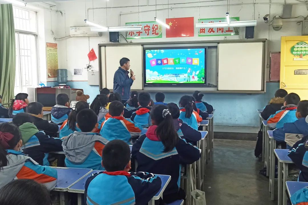 课堂上,老师向学生普及了大气污染防治有关知识、发放了《公民生态环境道德规范》手册、播放了大气污染防治动漫视频,授课内容受到了小学生的热烈欢迎。