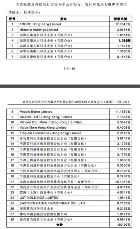 2018年11月,共达电声公告了《吸收合并万魔声学科技有限公司暨关联交易预案》,共达电声拟通过向万魔声学全体股东非公开发行股份的方式收购万魔声学100%股权。