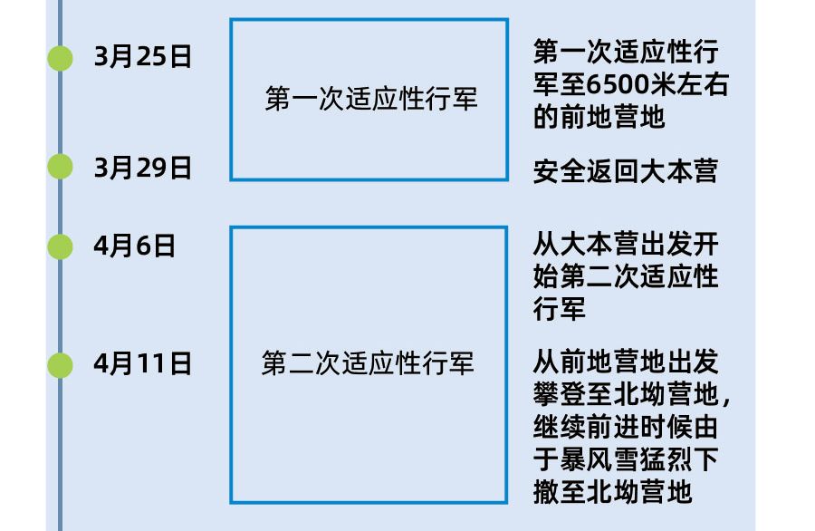 南北坡路线长度差异不大,南坡大本营海拔5364米,大本营之上设置了4个营地,北坡大本营海拔5130米,之上共计设置5个营地。