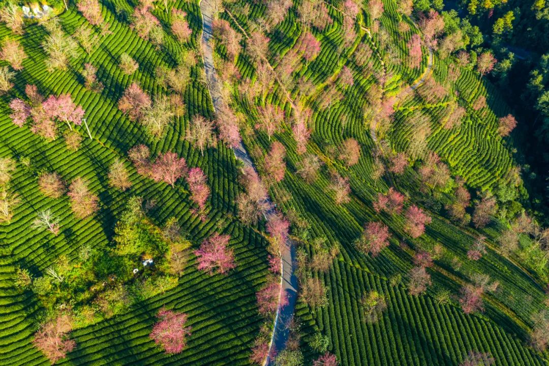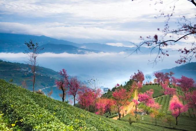 粉红色柔美的冬樱盛开在无量山绿色整齐的茶园,清晨,冬樱和日出一同在无量山的云海里醒来,这哪里是冬天啊,分明是一个春天!