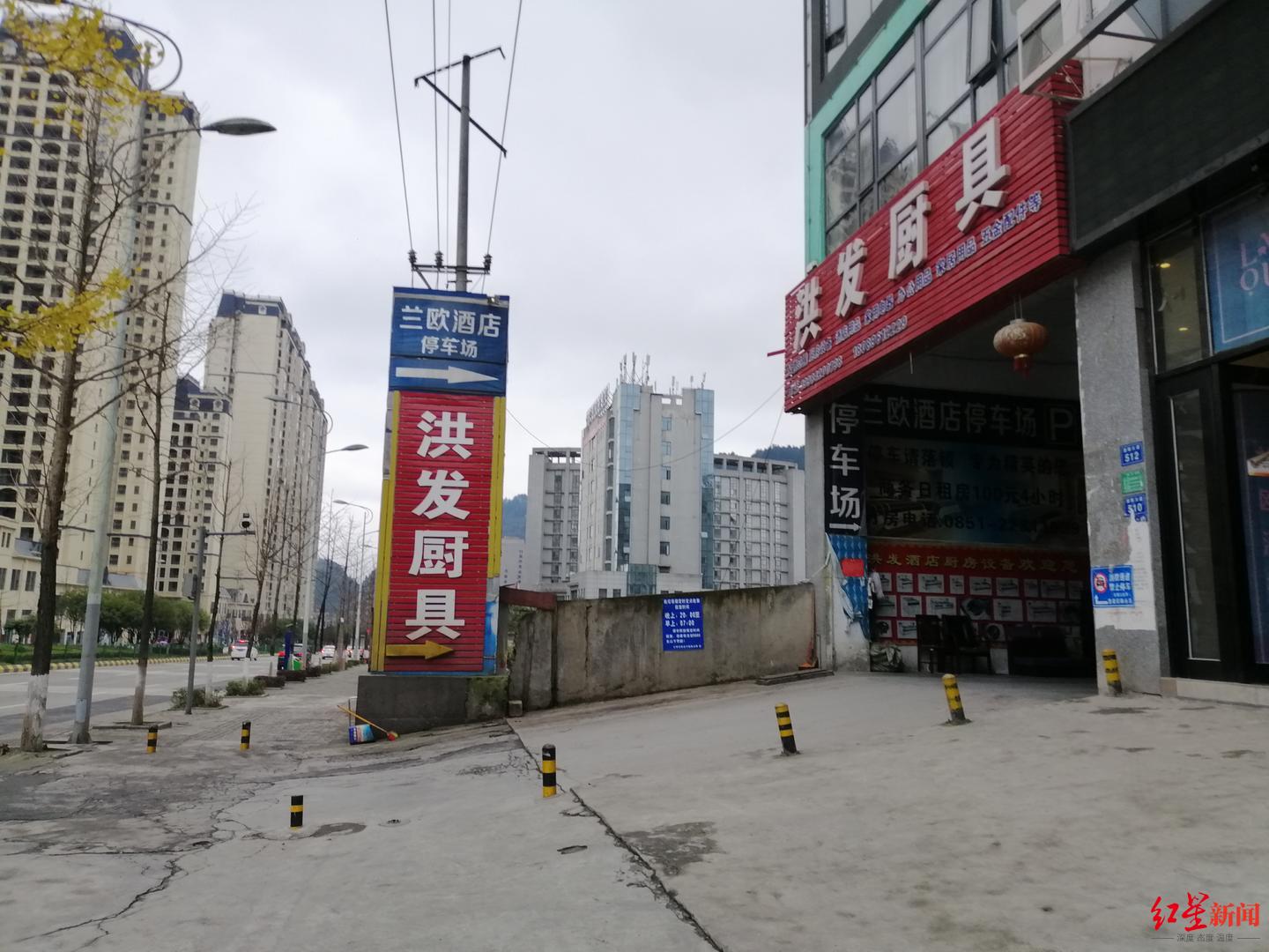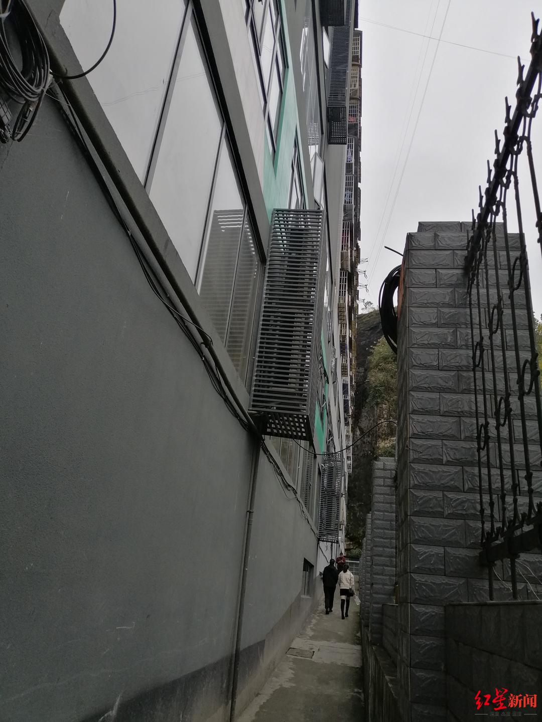 从四周情况来看,该栋建筑物背靠山壁,左侧为一处围墙包围的巨大建筑基坑,右侧与盐津街道办相邻,两者间为一条不足两米的人行通道,仅前方临靠大道。而洪发厨具位于建筑物一楼最里侧,且仅能通过地下停车场的出入通道进入。