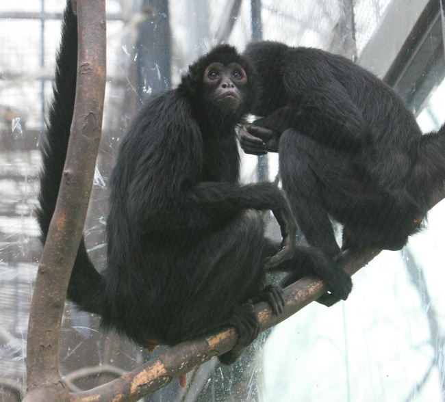 在北京动物园西区西侧长臂猿馆的两个北白颊长臂猿展区之间,居然夹着一个蜘蛛猴展区,这里展示的是原产于南美洲热带森林中的棕头蜘蛛猴。我国有蜘蛛猴展出的另一个动物园是广州长隆野生动物世界,展出的种类是红脸蜘蛛猴。