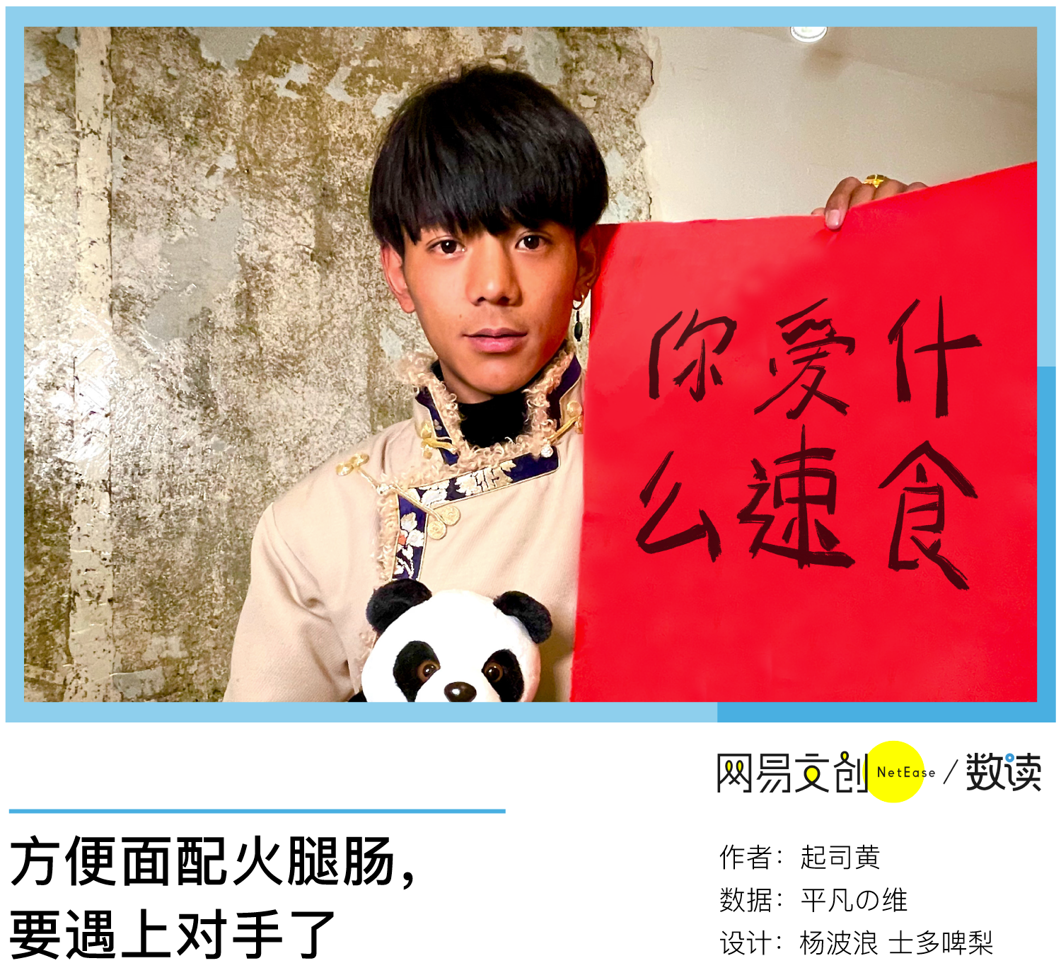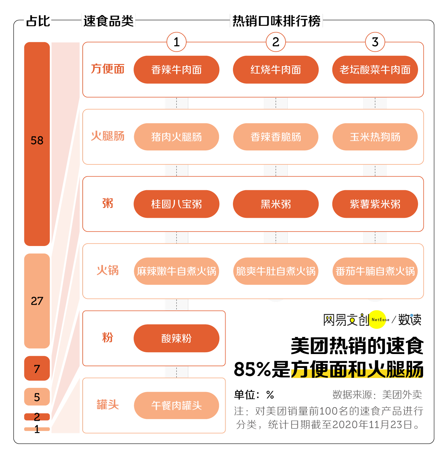 根据美团外卖数据,外卖热销的速食品中,58% 是方便面,27% 是“泡面搭档”火腿肠。和必须提前囤货的网红速食相比,随处可见的方便面显得更加亲民。