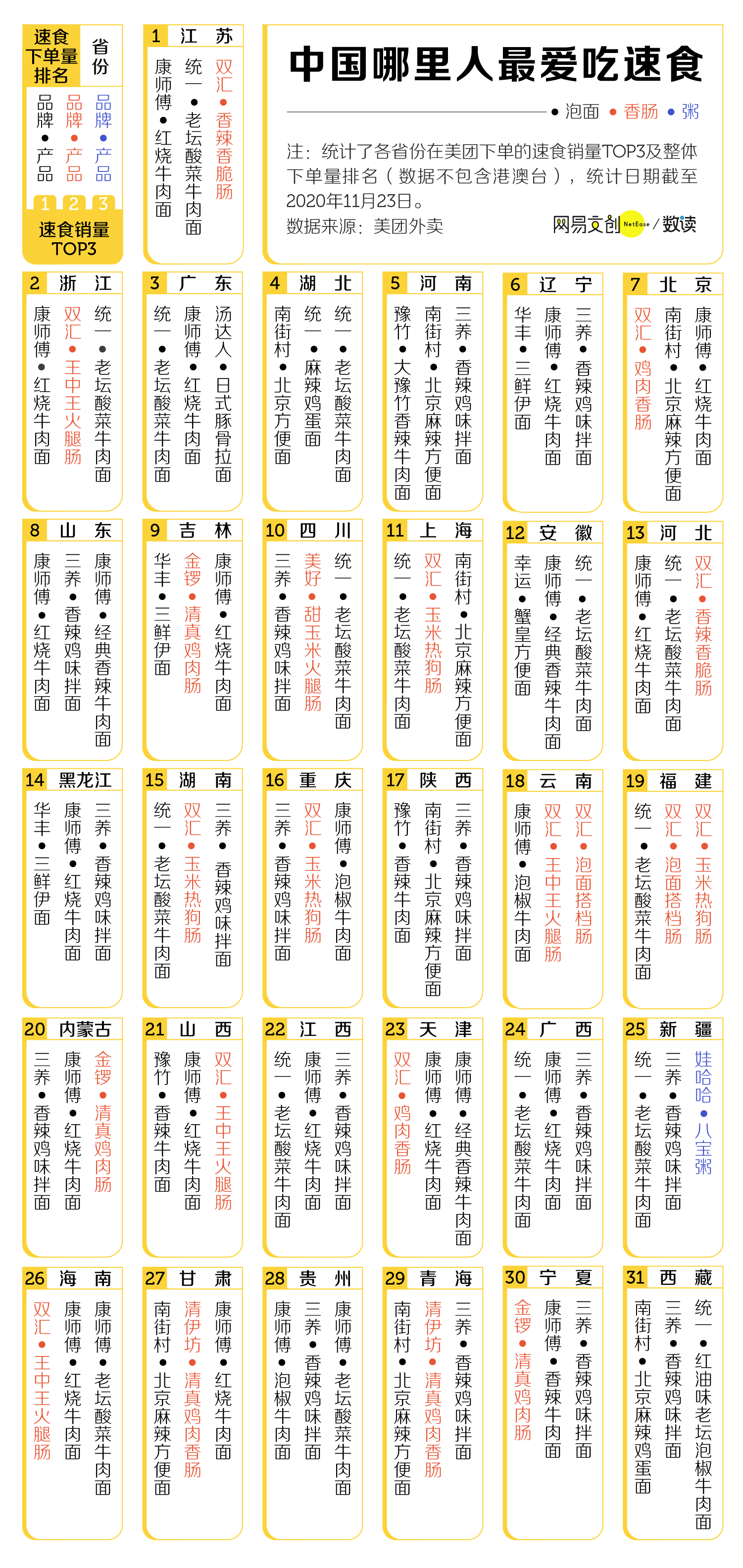 数据显示,中国各省份在美团下单的速食销量 TOP 3 中,接近六成的省份都是泡面加肠的组合,如果进一步看 TOP 5,包含这个组合的比例可以上升到近八成。