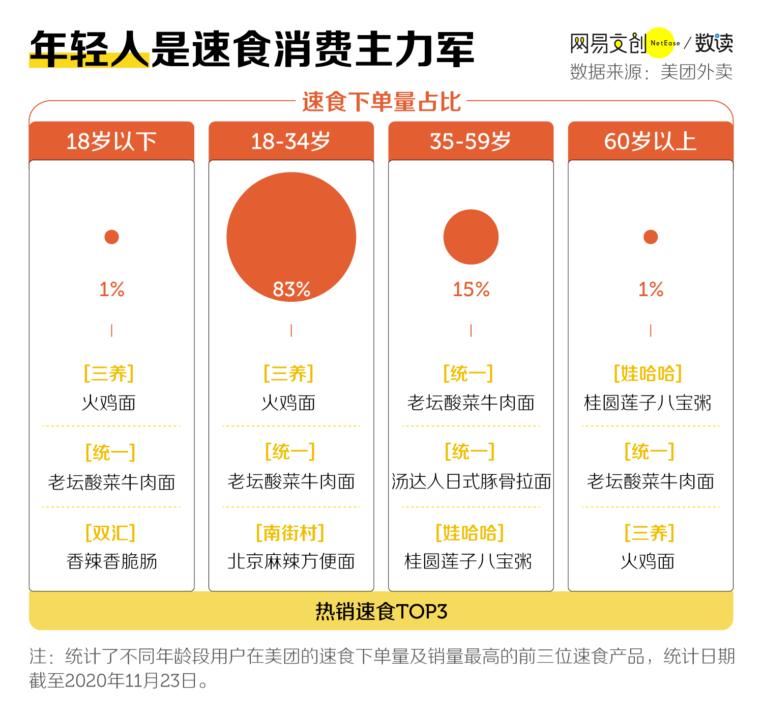 根据美团外卖数据,18 - 34 岁的年轻人速食下单量最高,占比 83%,其次是 35 - 59 岁的中年人,占比 15%。