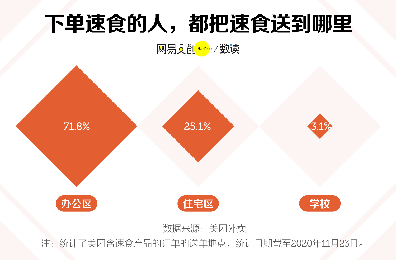 作为速食消费的主力军,吃速食的年轻人以社畜居多。数据显示,在美团下单的速食,有 71.8% 送到了办公区。