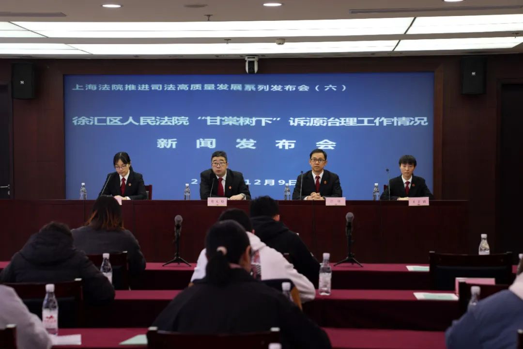 12月9日上午,上海市徐汇区人民法院(以下简称“上海徐汇法院”)举行新闻发布会,发布《上海市徐汇区人民法院“甘棠树下”社区法官工作白皮书》(以下简称“白皮书”),通报该院诉源治理工作情况,并发布典型工作案例。此次发布会系上海法院推进司法高质量发展系列发布会的第六场,上海徐汇法院党组成员、副院长蒋克勤通报白皮书的发布背景和相关情况,立案庭庭长许斌介绍白皮书的主要内容,蒋克勤、许斌、社区法官工作室王宏霞法官回答记者提问。发布会由办公室主任贾翌主持。
