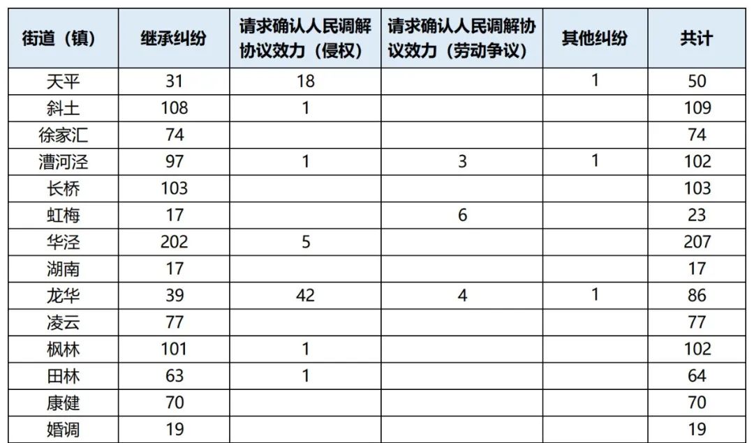 白皮书分析指出,近年来上海房产价值提高,群众法律意识增强,在基层社区中,随着人口老龄化程度日益加深,居民对继承相关法律的关注度较高,法院审理的继承纠纷案件也呈多发态势。华泾镇地处徐汇区最南端,房屋类型以居民住宅为主,商业写字楼相对较少,而居民住宅中老人所占比例又较高,因此继承类司法需求较大。民事调解书对财产权属、继承人顺位、继承份额均作出详细说明,固定案件事实,更有利于定分止争,使当事人信服。