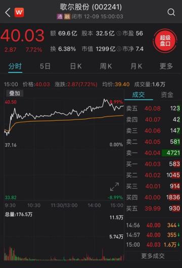 网传这款耳机是由歌尔股份独家代工的,据媒体报道,其公司持“默认”态度。受此消息影响,歌尔股份早盘大幅高开3.5%,股价一路走高,盘中涨幅一度扩大至7%上方,随后维持高位震荡。截至收盘。歌尔股份涨幅为7.72%,股价收报40.03。总市值达1299亿元。