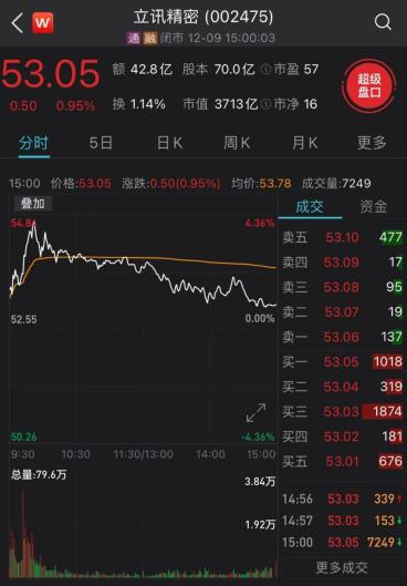 与歌尔股份同是千亿市值的龙头立讯精密近日也跟涨,盘中涨幅一度达2.17%。收盘后收窄至0.95%,股价收报53.05元,最新市值为3713亿元。
