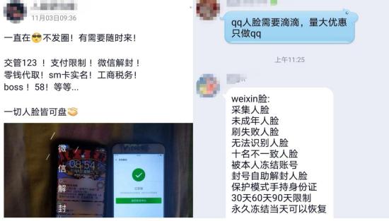 相比起风险过高的网贷,微信解封、零钱代取、解除支付限制,以及代过58同城、陌陌、伊对、探探、QQ、微博、地方税务等各大App的人脸实名认证则是群里这些人宣称的更为“常见的服务”。在这里,有人想要利用App账户引流;有人想要获得支付类App账户的高等级,提升额度;也有人想要通过注册多个账号薅羊毛;甚至于有人想要拥有他人的人脸认证,只是为了玩个游戏……