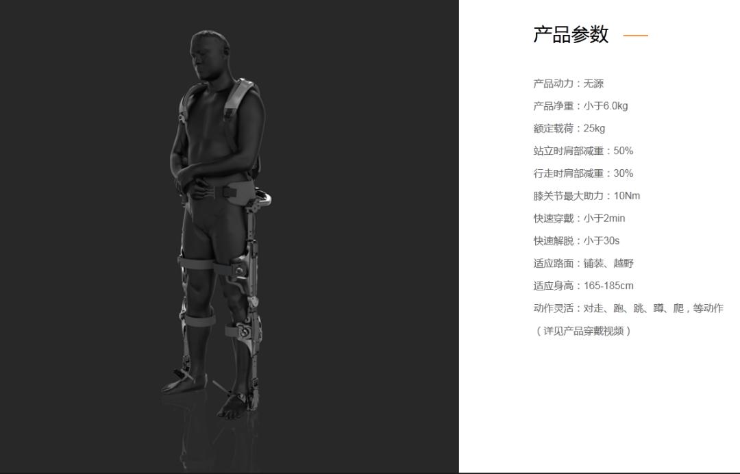 牛迪科技的资料显示,他们研制的普力外骨骼为纯机械式助力,系统总重小于5kg,穿戴后人体最大承重可达70kg,行走时肩部减重30%,站立时肩部减重50%,快速穿戴时间小于2min,快速解脱小于30秒。