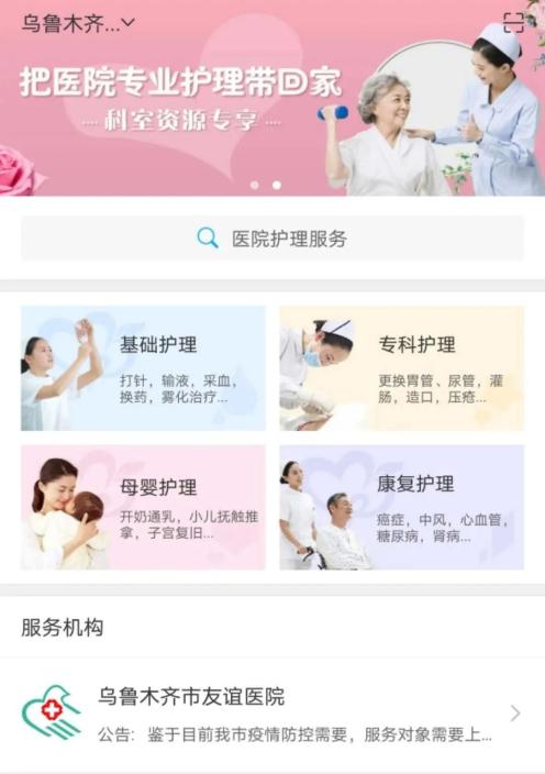 2019年2月12日,国家卫生健康委发布《国家卫生健康委办公厅关于开展“互联网+护理服务”试点工作的通知》中指出,依托互联网信息技术平台,派出本机构注册护士提供“互联网+护理服务”,将护理服务从机构内延伸至社区、家庭。同年3月,乌鲁木齐市友谊医院的“云护”服务率先上线,市民下载“家庭医护”APP,注册登录后就能选择护理项目,预约护士上门服务。