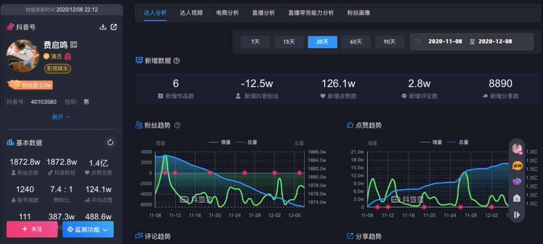 抖音数据说明了一切:总粉丝1873.1万,看起来是头部网红的水准。但近30天新增粉丝数为-12.5万,不涨反跌自然是“过气”之兆。近30天新增作品6个,平均5天更新一段短视频,勤勉度约等于晒网。时间倒回至2018年2月2日,一部简单的“师父我坚持不住了”的作品获得了485.9万赞。而费启鸣最近一个月的总获赞数仅108.16万,远不如巅峰期单部作品的四分之一。那时他是全抖音的共享男友,火到虎扑直男摩拳擦掌。如今他是转型演员的网红,抖音只剩遗迹。
