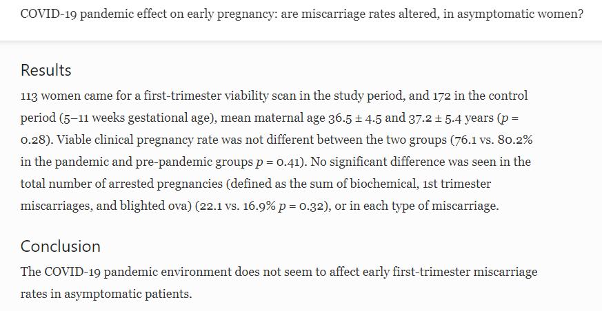 比如,他所列举的一项刊登在《美国医学会杂志》上的研究就显示,医学人员在对比了无症状感染者中孕妇群体的早期流产率和新冠疫情袭来之前孕妇群体的早期流产率后,发现这个比率并没有因为感染新冠病毒而受到影响。