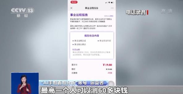 “AI手相面相分析”账号 运营者:面相是9.9元,之后很多人都会测第二次或者第三次,最高一个人可以测60多元。记者:一天能测多少?