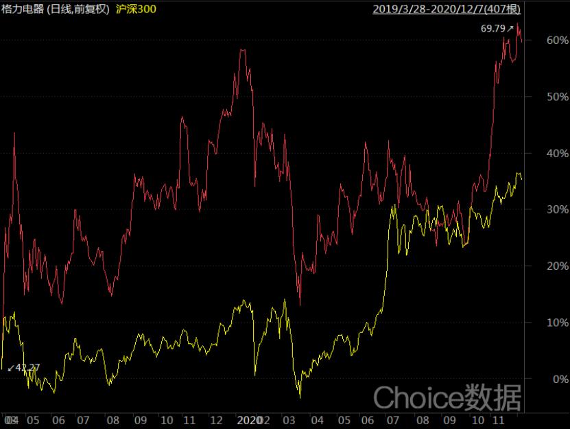 本文基于公开资料撰写,仅作为信息交流,不构成任何投资建议。格力电器(SZ:000651)昨日(12月9日)昨日大跌4.65%后,62.61元的股价正式回归年初水平,“悬停”依旧()。这意味着,坚定重仓格力的价值投资者,2020年几乎错过了A股年度结构性牛市的红利。