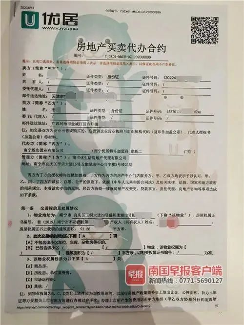 据广西当地媒体《南国早报》报道,阿蒙(化名)是天津人,今年6月,一位自称是优居房产中介公司工作人员的韦某联系阿蒙,说有客户想购买阿蒙在南宁的房子。
