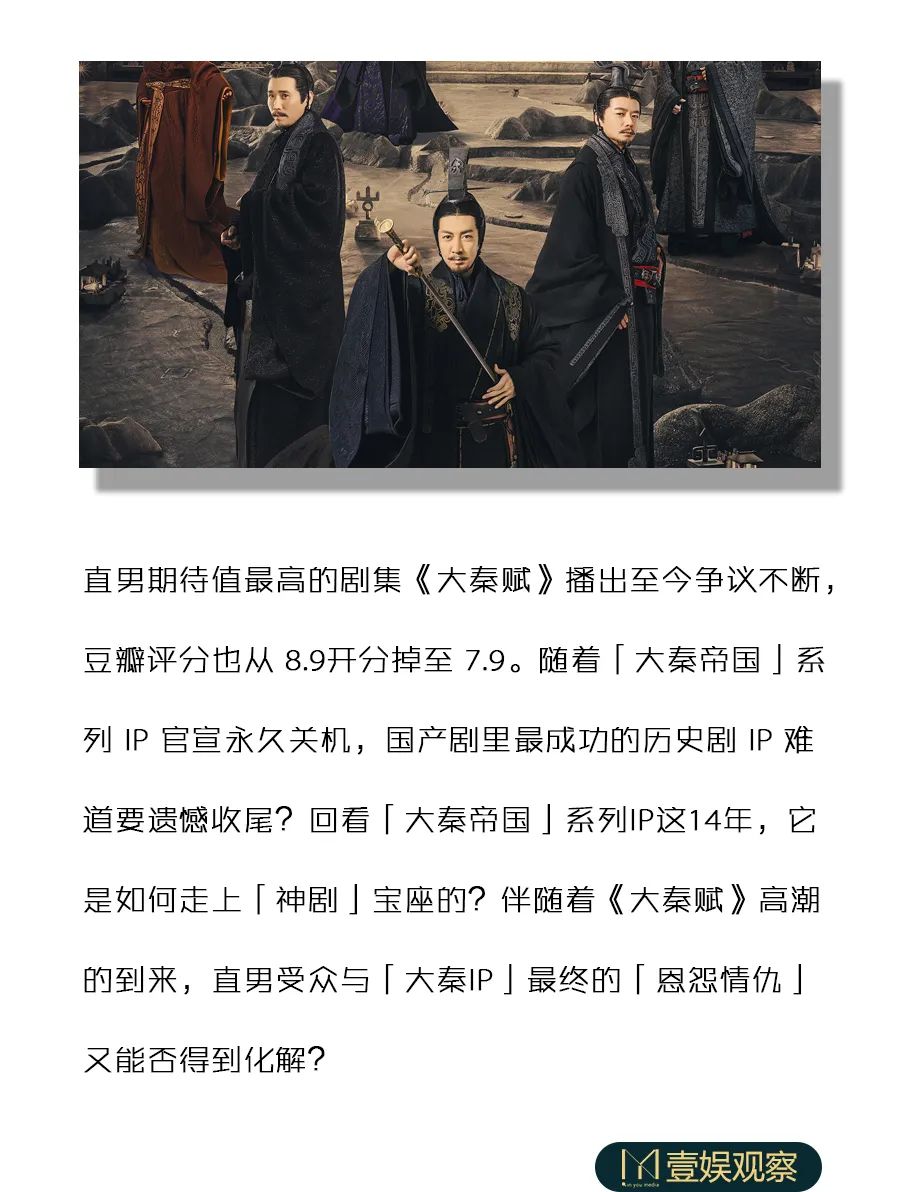 《大秦赋》剧照《大秦赋》豆瓣评分从8.9迅速跌至7.9,聚焦直男用户的虎扑值也从95分跌至92.4分。随着“大秦帝国”系列IP官宣永久关机,《大秦赋》的争议声不断高涨,横跨14年创作周期、最成功的历史剧IP难道就要在遗憾中收尾?回看这14年,“大秦帝国”系列如何在网络上逐渐成为第一历史剧IP?直男受众又是如何将其推向“神剧”巅峰?