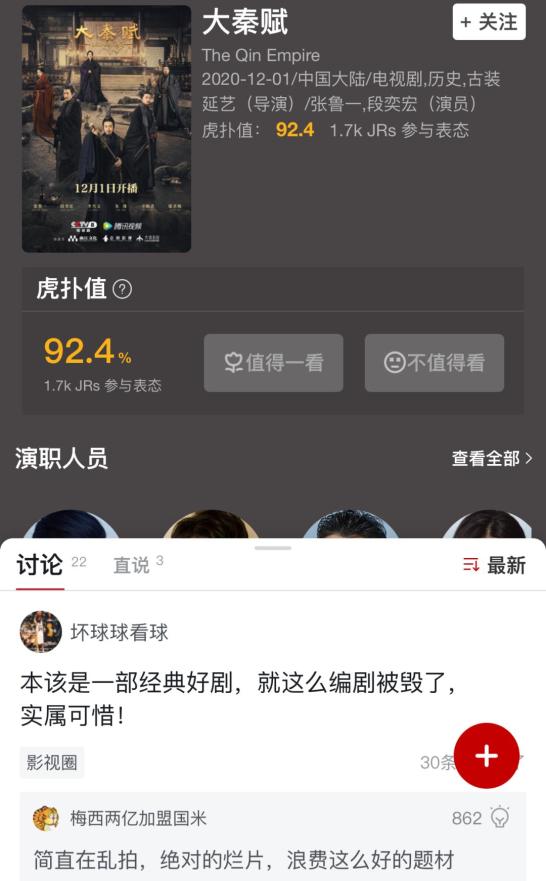 虎扑网友针对剧集的选角、台词、节奏叙事等多方位提出质疑,并纷纷表示已弃剧,转而回温经典。此时,关于《大秦赋》的导演、编剧,甚至新入的出品方企鹅影视,也被虎扑网友进行多方位“声讨”。