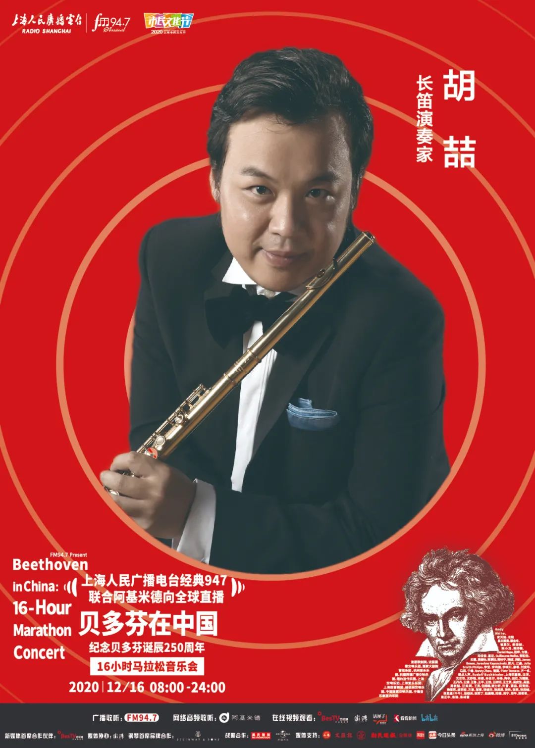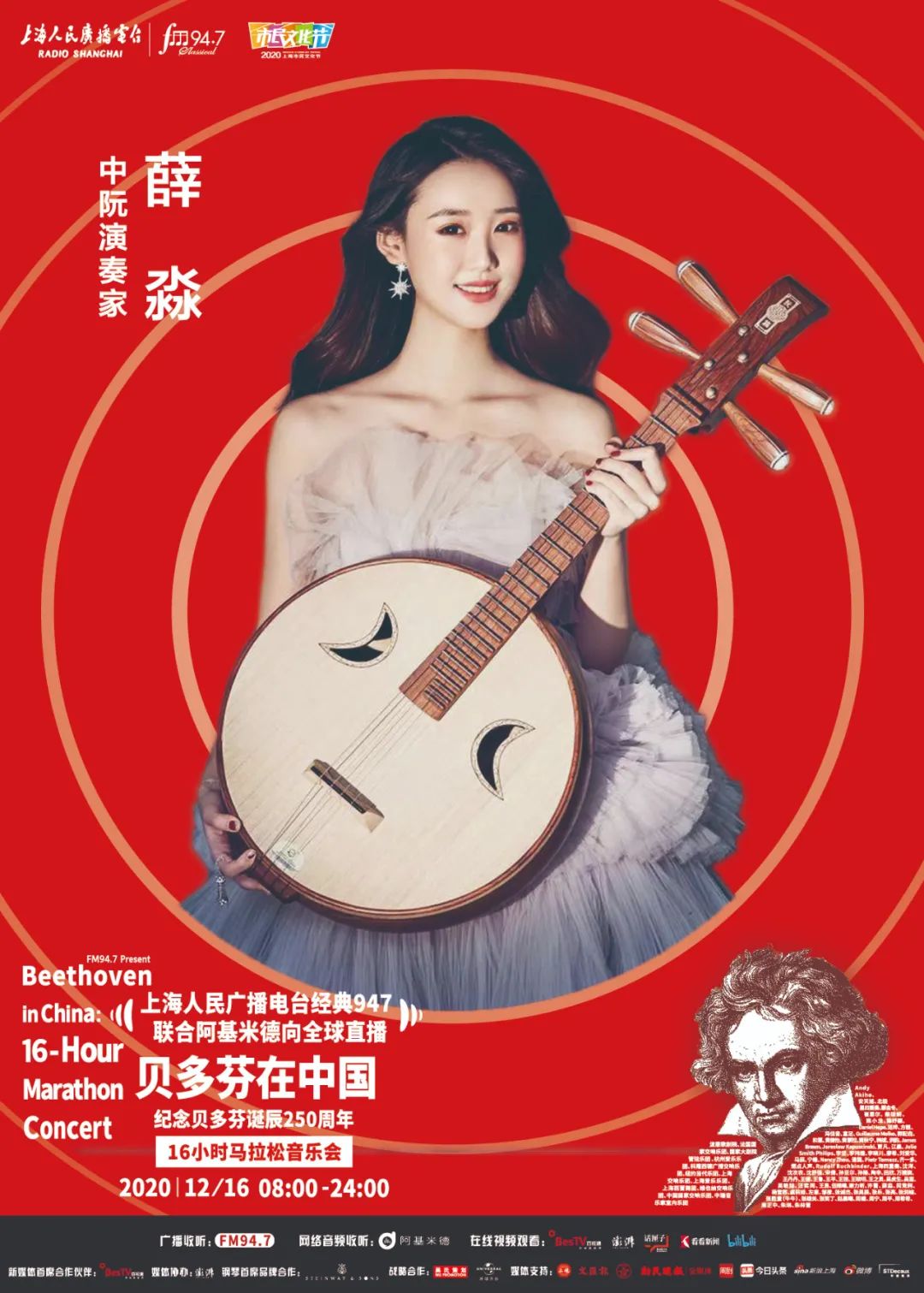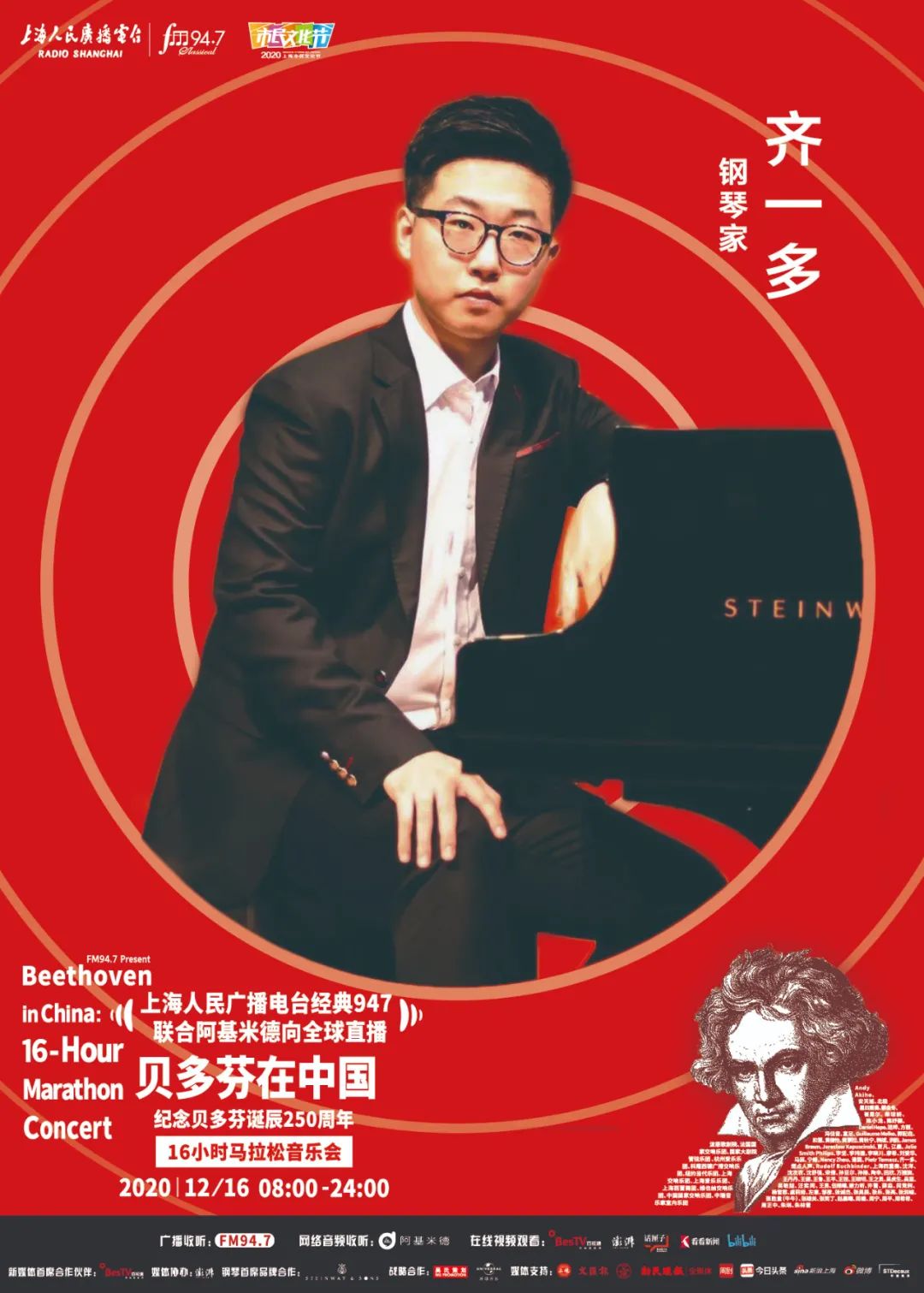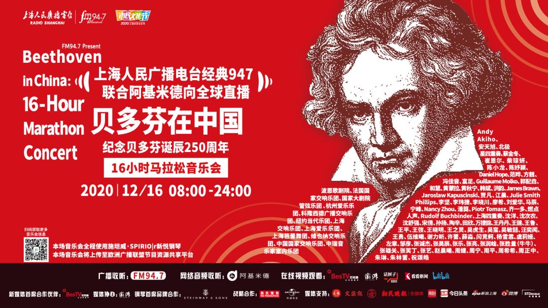 上海人民广播电台“经典947”频率联合阿基米德App、话匣子FM,将于2020年12月16日贝多芬诞辰纪念日当天,向全球同步直播《贝多芬在中国——纪念贝多芬诞辰250周年16小时马拉松音乐会》。作为2020上海市民文化节美育系列活动之一,此次马拉松音乐会通过“嘉宾访谈+现场演奏+音视频赏析”的形式,从音乐家、学者、乐评人、策划人、乐迷等多重视角,全方位展现贝多芬的音乐力量及人文精神,呈现古典音乐在中国的普及发展。今天将公布第八波参与的音乐家们