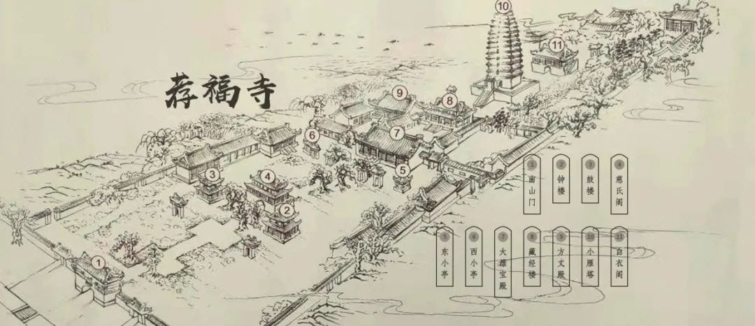 荐福寺古建筑 中国著名皇家寺院荐福寺,是唐代著名皇家寺院、重要的佛经翻译场所。现存荐福寺古建筑为明清两代重修,寺院有丝路明珠小雁塔、荐福寺历代重新修缮碑石刻及明清石刻拴马桩等,中国著名的“关中八景”之一——雁塔晨钟,正出自荐福寺。