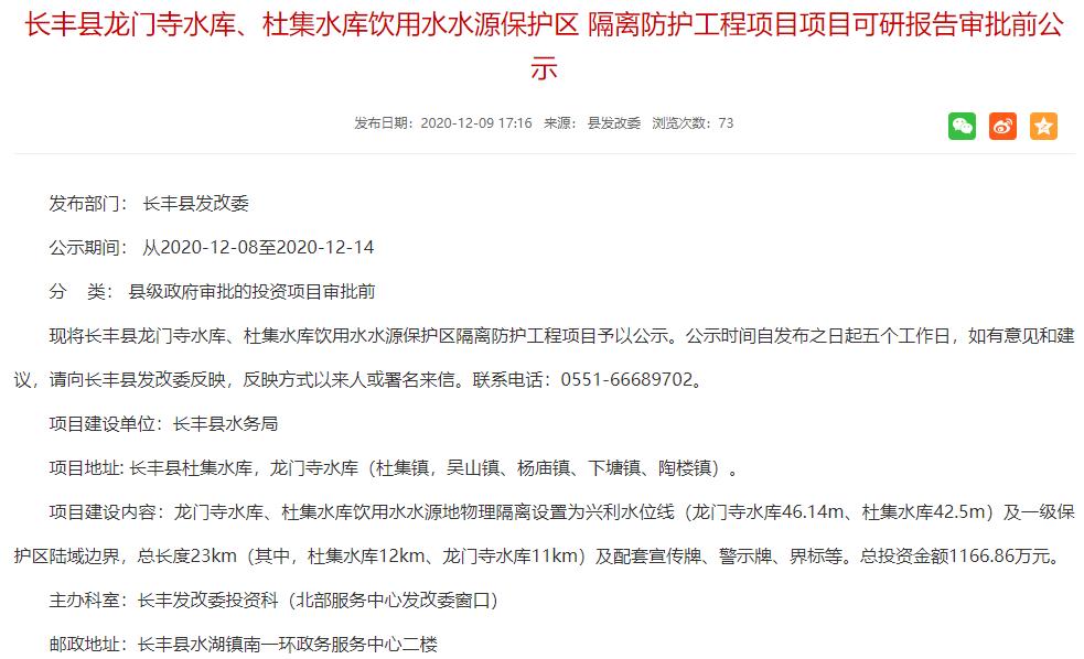 此次实施的长丰县龙门寺水库、杜集水库饮用水水源保护区隔离防护工程,总投资金额1166.86万元。建设内容包括龙门寺水库、杜集水库饮用水水源地物理隔离设置为兴利水位线(龙门寺水库46.14m、杜集水库42.5m)及一级保护区陆域边界,总长度23km(其中,杜集水库12km、龙门寺水库11km)及配套宣传牌、警示牌、界标等。