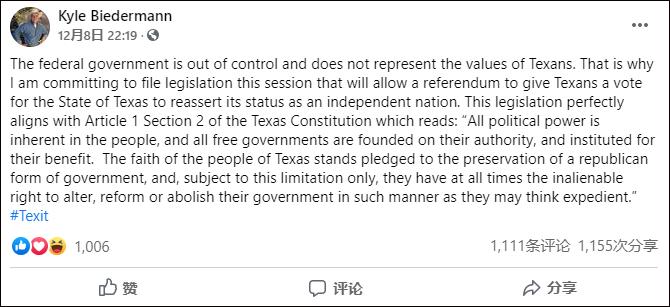 当地时间12月8日,美国得克萨斯州众议员比德曼(Kyle Biedermann)在脸书贴文称,他计划在州议会提出一项法案,允许对“分裂国家”进行全民公投,使得克萨斯州恢复其独立国家的地位。