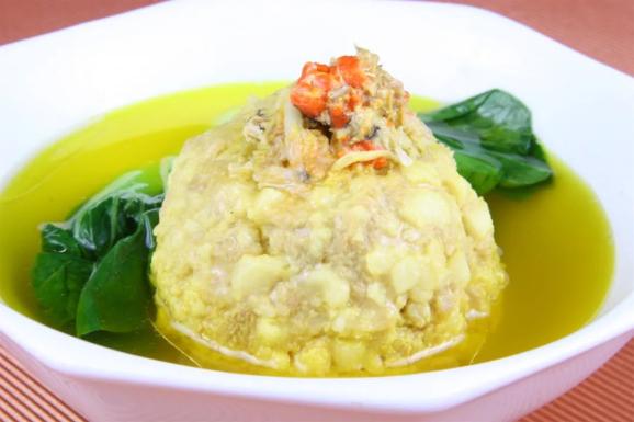 文思豆腐的制作颇为讲究,先将豆腐表面的一层老皮削去,再一刀刀地竖着切。这是切片,这片要切得薄如纸张。切完,把豆腐片顺势用刀斜着一抹,让其“躺”着,呈阶梯状,再切成细丝。一块细软的豆腐,通常要用大片刀横切至少88刀,竖切188刀,几分钟的光景,一块易碎的豆腐就成了几千根豆腐丝,放在清澈的水中,根根清晰、粗细均匀、细如发丝。还必须不黏不连,不碎不断,这考量的是刀工。这功夫看似简单,没有三年五载的操练,实是难以胜任。每年金秋时分,有些餐厅推出最顶级的时令美味蟹粉文思豆腐羹,如发丝幼细的豆腐丝,配上小棠菜,再加上金黄闪亮的蟹粉蟹膏,宛如一幅色彩缤纷的水墨画,入口鲜掉眉毛,尝过终身难忘!