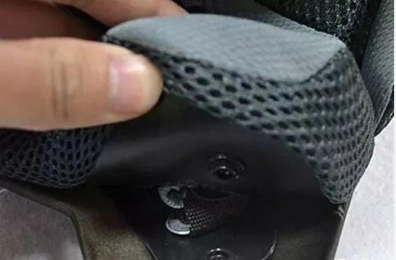 ▲头盔内侧必须装有防冲击衬垫,与头部吻合的表面衬垫材料为稀网眼衬布,应具有吸汗和吸收头部油脂的作用。衬垫上应开有深度在10MM以上的通气槽,以使头盔内空气流通。
