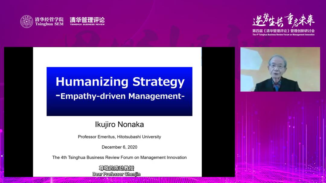 Edward B Roberts教授日本一桥大学教授、全球知识管理大师野中郁次郎(Ikujiro Nonaka)教授分享了《人性化战略——同理心驱动的管理》。他认为,现代管理实践存在三个缺陷:过度规划,过度分析、过度合规。这些缺陷的产生是因为预先假设了现实,而没有真正了解现实的多变状态,忽略人是经济中创造价值的主体。他认为,隐性知识和显性知识二者并非完全可分。在AI时代,虽然可以通过AI技术构造和重组显性知识,但如果缺乏人的感知,人工智能将很难实现社会化。他指出实践智慧是理解个人、团队、组织和环境的统一性,领导者需要抱有动态的心态,更好地理解看似矛盾的问题和要素,泰然面对可能的积极变化。他认为,亚洲的领导者们必须尝试培养自己的实践智慧,提高道德和伦理意识,增强同理能力,培养智慧才智。最后,他寄语大家,领导者可以成为贤者,进而改变世界。