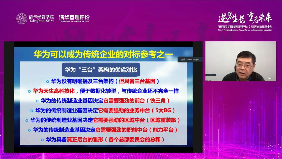 张昌武先生宁波诺丁汉大学李达三首席教授、丹麦哥本哈根商学院教授李平教授探讨了《数字化转型与三台组织架构》。基于对数字化时期的企业组织架构研究,李平教授提出了“三台组织架构”。生态架构最初主要是解决信息不对称、资源不对称、能力不对称等问题,作为一个分布式架构,会根据不同情况进行不同的分配。他将架构后台比作头部,中台比作躯干,前台比作四肢,指出后台主承担战略智库的角色,负责长期战略设计,开展基础研发,培育未来品牌,培养文化价值观和领导力四项工作。三台组织架构满足了模块内部对多元组成要素的需要,可以实现“铁三角”搭配,实现多种模块组合形成互补、统一协调的前中台配合。