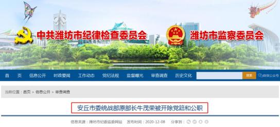 牛茂荣身为党员领导干部,背离初心使命,无视党纪国法,给党的事业和形象造成了严重损害和不良影响,情节严重。依据《中国共产党纪律处分条例》、《中华人民共和国监察法》等相关规定,经中共潍坊市纪委常委会会议研究并报中共潍坊市委批准,给予牛茂荣开除党籍、开除公职处分;收缴其违纪所得。