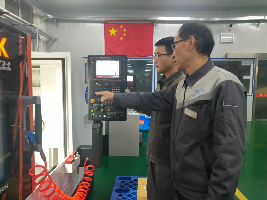 企业质量管控人员指导员工操作机器设备